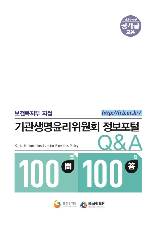 보건복지부 지정 기관생명윤리위원회 정보포털 Q&A 100문 100답