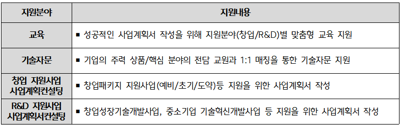 - 성공적인 사업계획서 작성을 위한 교육 및 사업계획서 진단 및 분석을 통한 맞춤형 컨설팅 지원