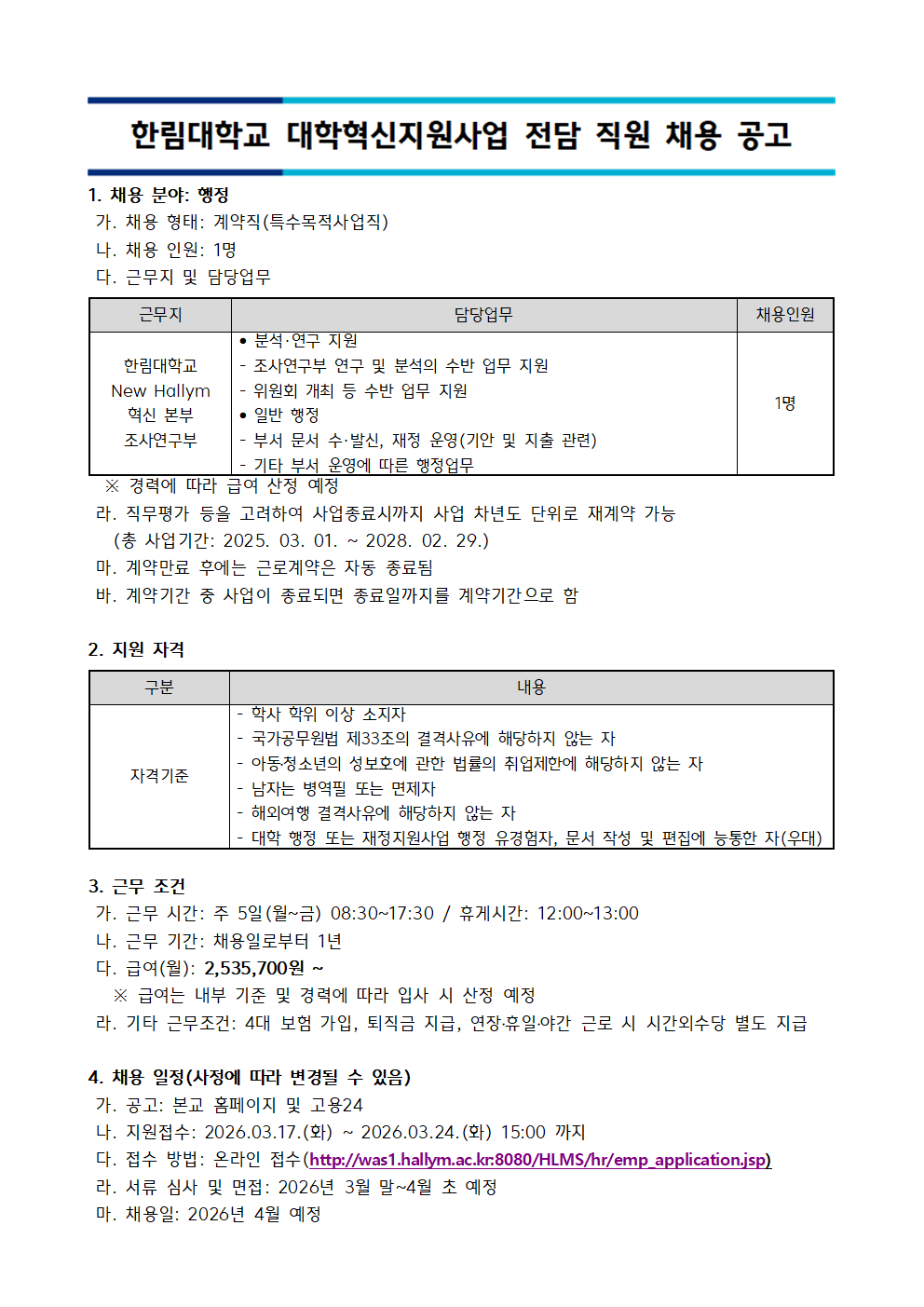 | 1164 | [한림대학교] 대학혁신지원사업 전담직원 채용 공고(~3월 24일 15:00까지) 새글 | 총무팀 | 2026-03-17 | 180 | |