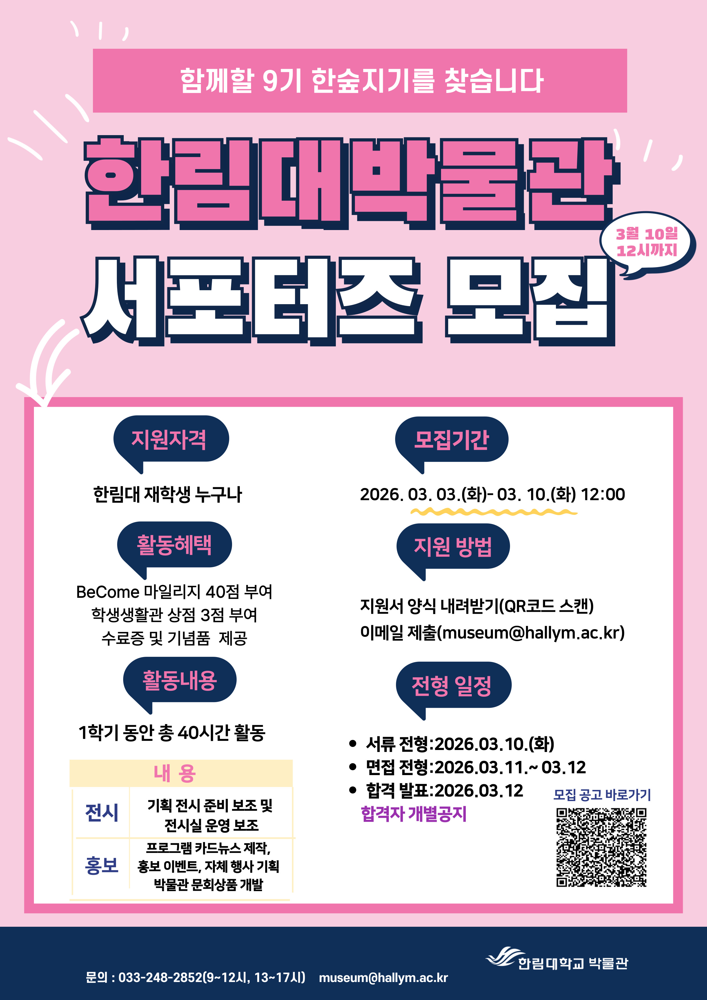 박물관 전시운영보조 및 홍보 콘텐츠 제작에 대해 관심 있는 재학생 여러분의 많은 지원 바랍니다.