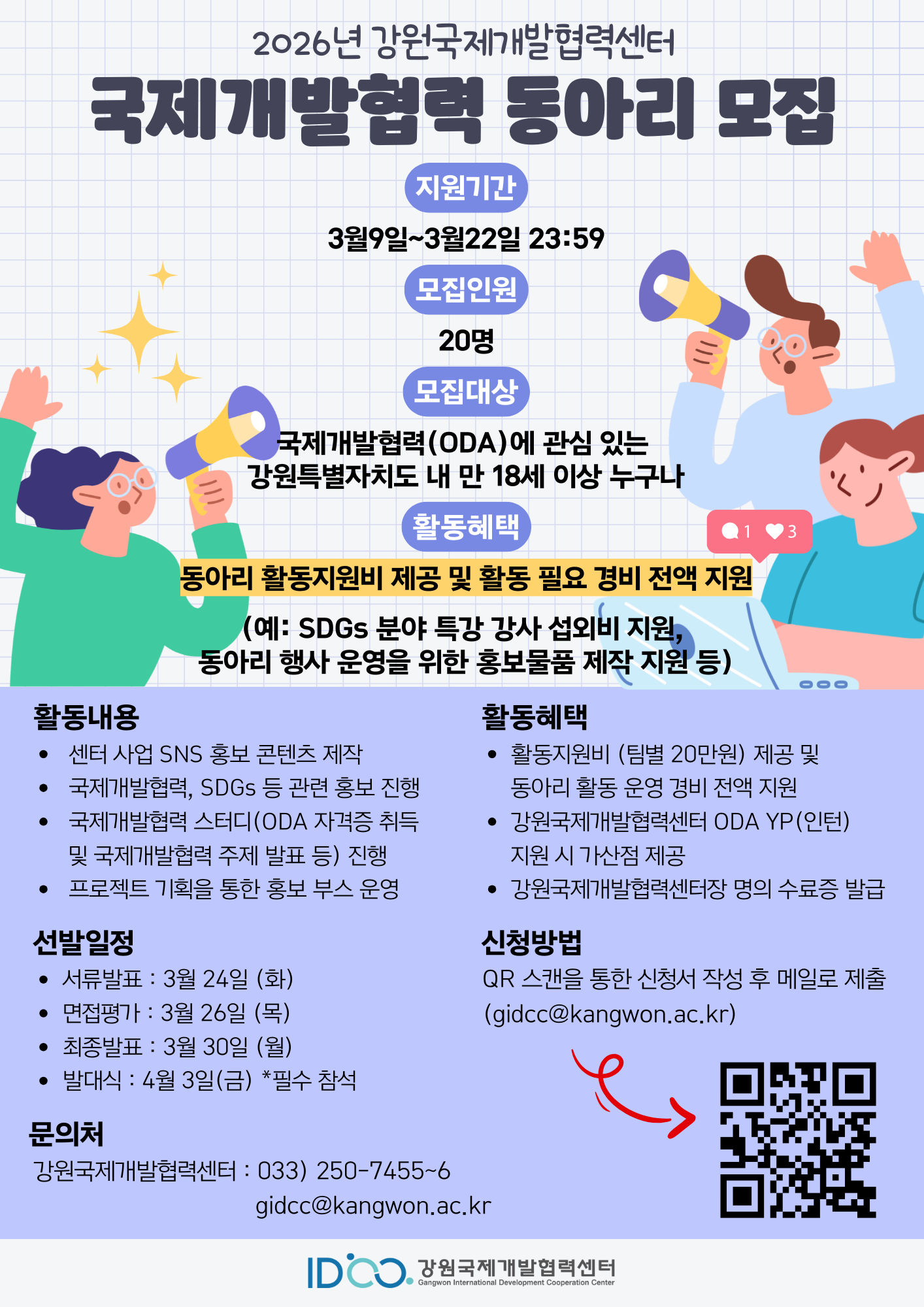 강원국제개발협력센터에서 <2026년 국제개발협력 동아리>를 함께 운영할 동아리원을 모집합니다. 국제개발협력(ODA)에 관심 있는 많은 분들의 적극적인 지원 바랍니다.