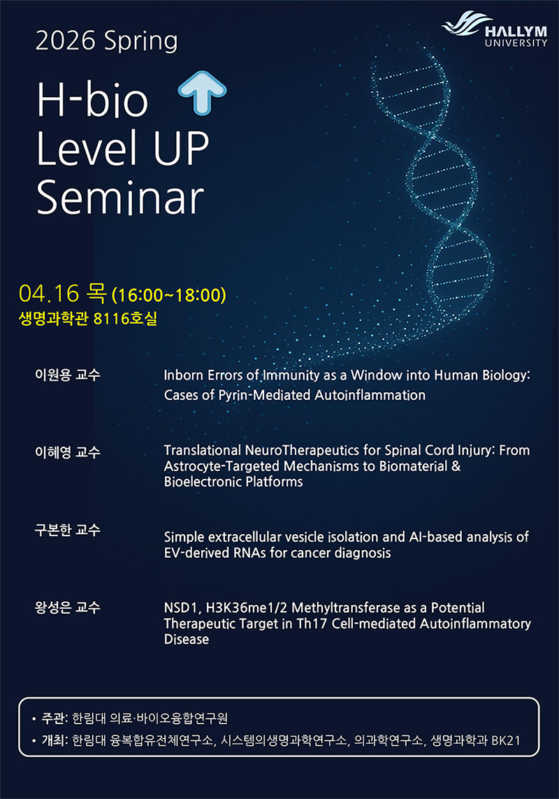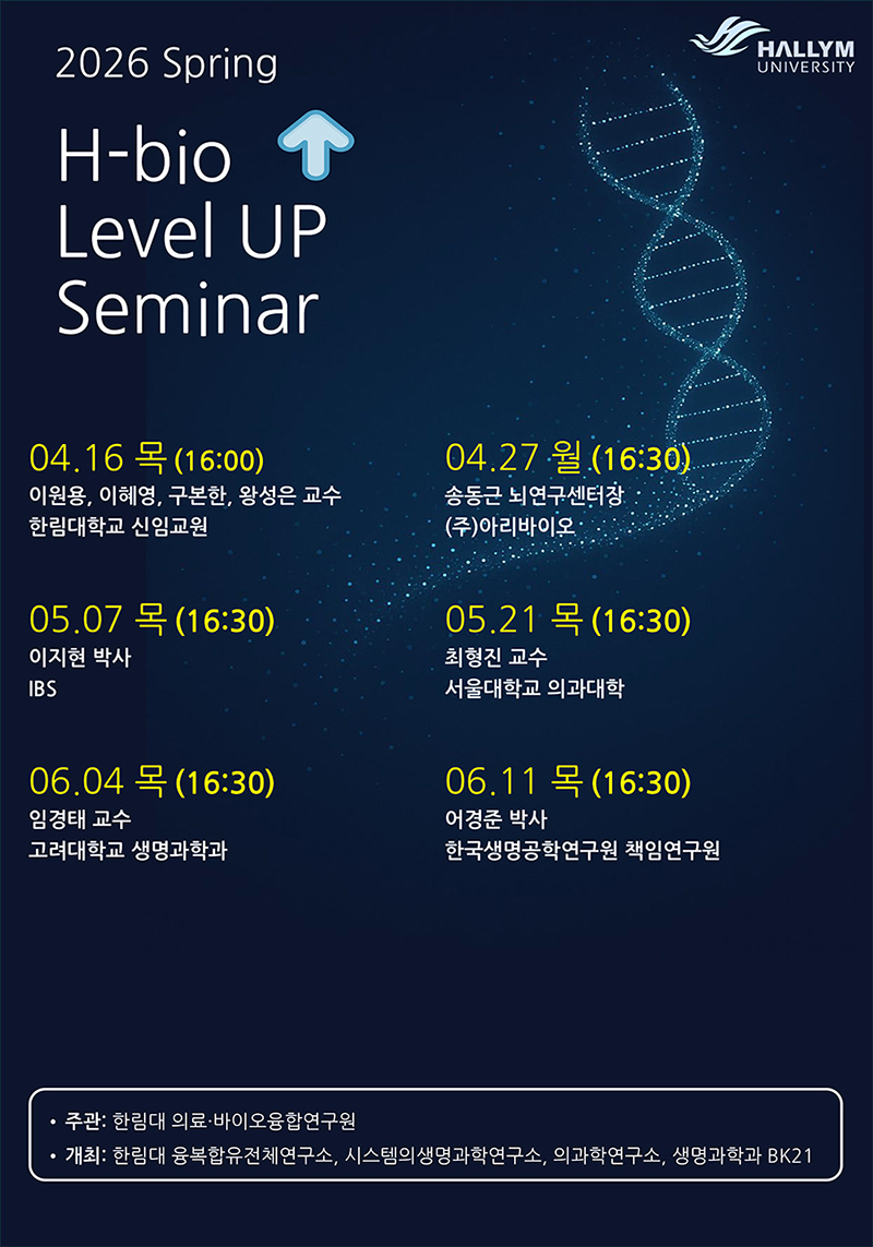 본 연구원에서는 4월 16일(목) 의료·바이오 분야의 최신 연구 성과를 공유하고 지산학 네트워크를 강화하기 위해 「H-bio Level UP Seminar」를 개최합니다.