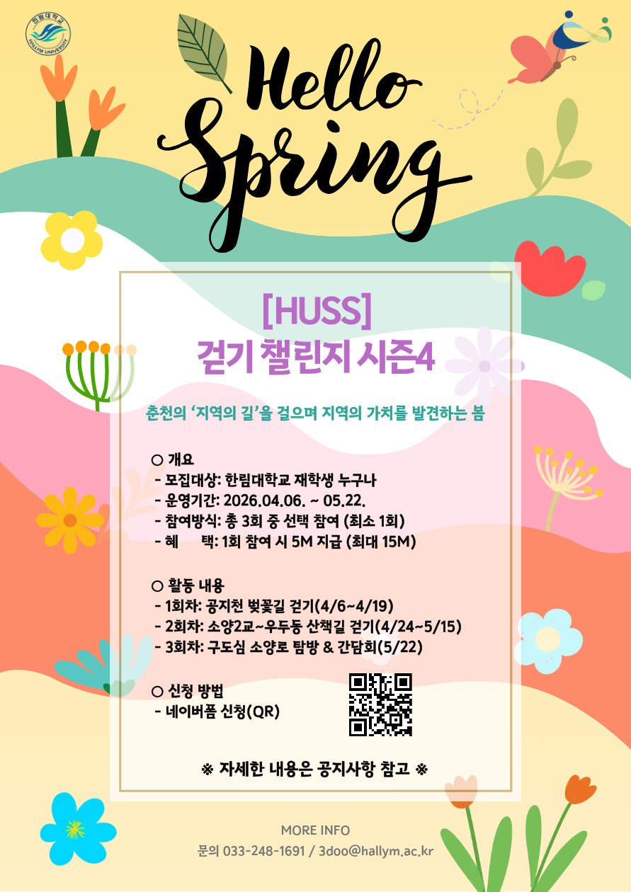 인문사회융합인재양성사업(HUSS)의 비전인 지역가치 창출과 지역혁신을 선도하는 Local C-nergy 융합인재 양성을 바탕으로, 춘천의 다양한 지역의 길을 직접 걸으며 지역의 문화와 가치를 체험할 수 있는 걷기 챌린지 시즌4 봄에 봄내길 걷기참가자를 모집합니다.