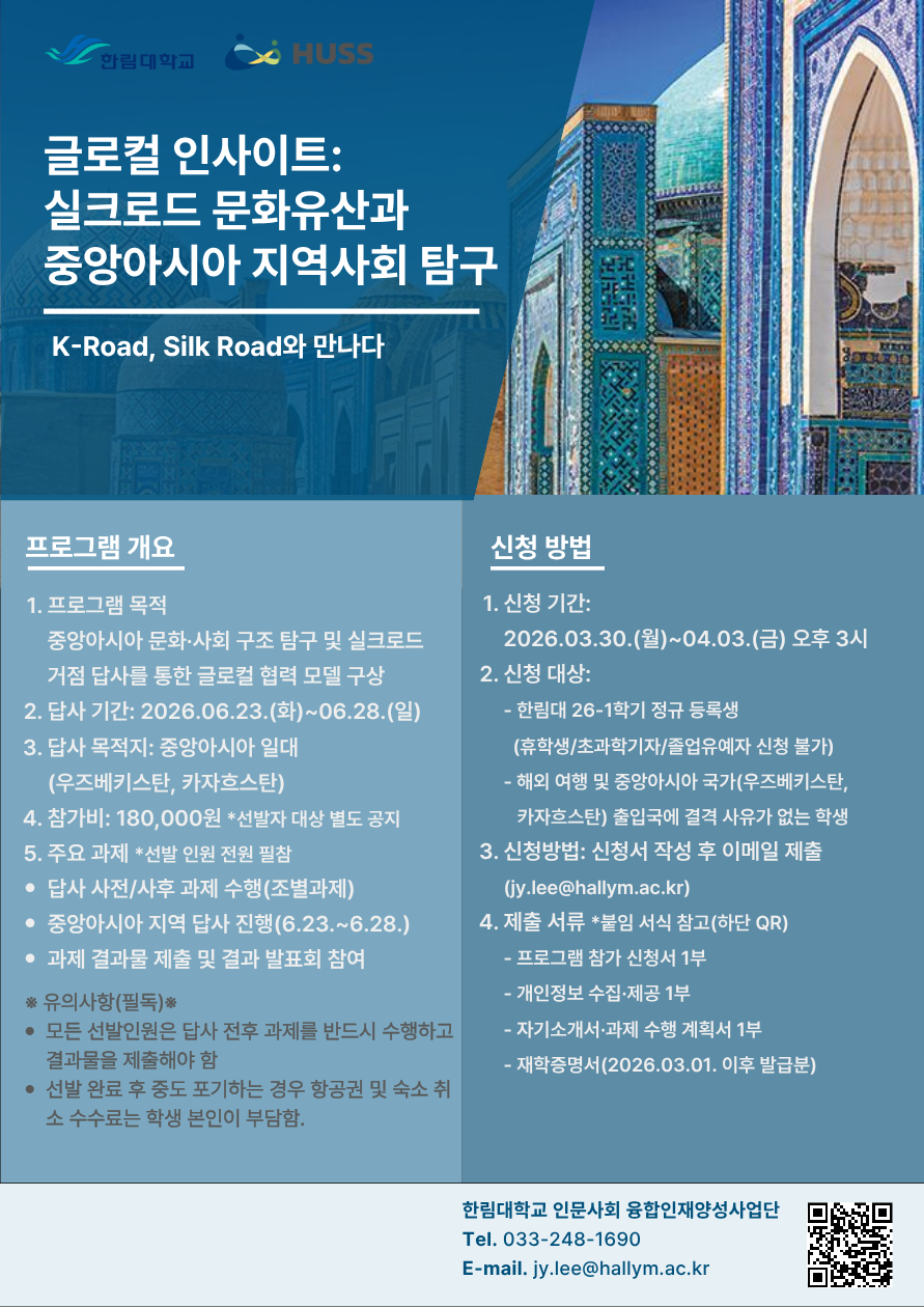 중앙아시아 실크로드 지역을 중심으로 역사·문화·사회 구조를 탐구하는 답사 프로그램을 운영하고자 합니다. 참여를 희망하는 학생들이 많은 관심 바랍니다.