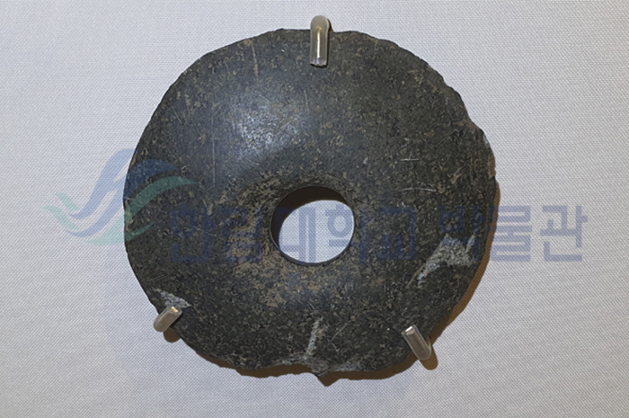 가운데 구멍을 뚫어 나무 막대 등을 끼울 수 있도록 하였고 구멍 둘레가 두껍고 날刃쪽으로 가면서 얇아져 날카로운 날을 이루도록 되어 있습니다. 날쪽은 깨지고 부서진 것이 많아 사용한 흔적이 많은 것으로 나타납니다.