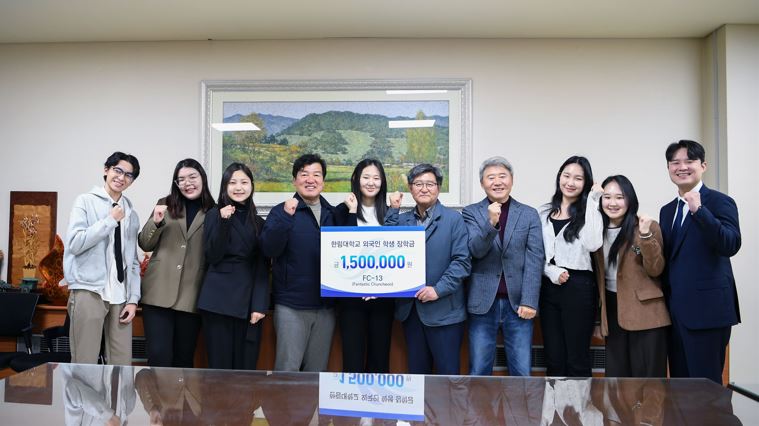 한림대학교(총장 최양희) 교원 및 춘천 지역 인사 13명으로 구성된 Fantastic Chuncheon-13(이하 FC-13)이 12월 10일(수) 학내 본부 소회의실에서 장학금 수여식을 열고, 2025학년도 2학기 한림대학교에 입학한 키르기스스탄 국적 유학생 6명에게 장학금 150만원을 전달했다.